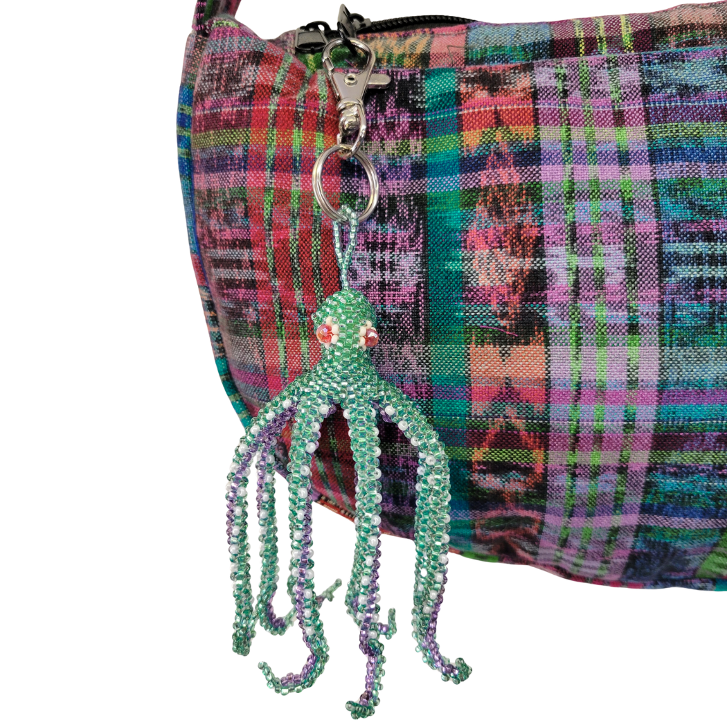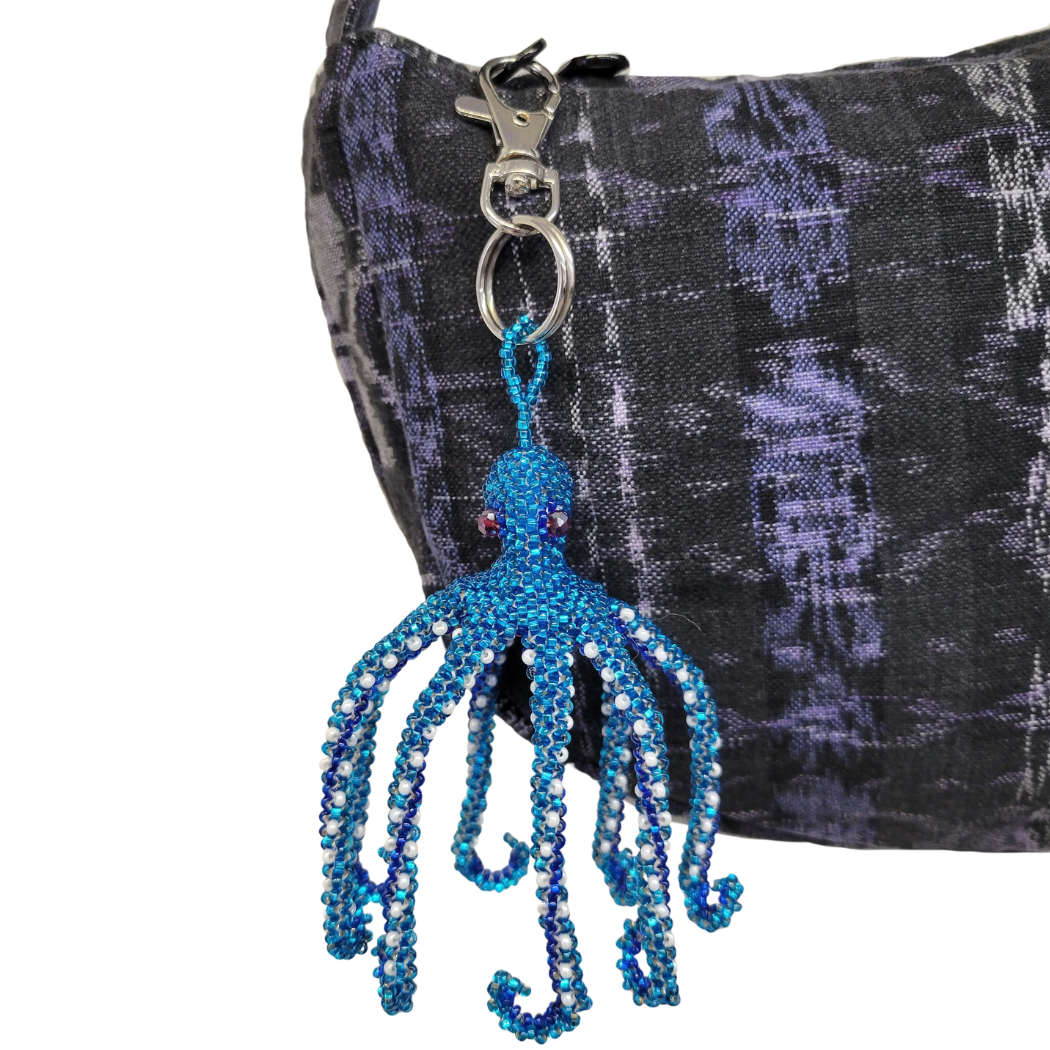 Attached to your bag or backpack, this octopus charm will dance as you navigate your day. The eye-catching ornament is made of glistening seed beads, with a pair of crystal beads for eyes.
