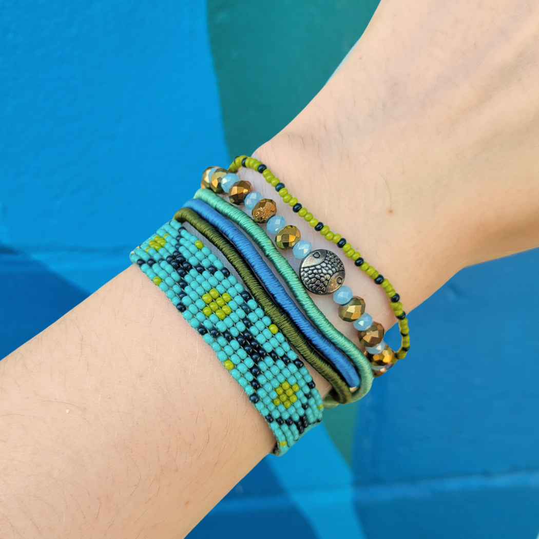 Can't decide what to wear on your wrist? Wear a little of everything! This bracelet combines a woven half-inch band of seed beads, three cotton cords, a string of seed beads, and a string of crystal beads, capped with a pewter charm. Assorted color combinations.