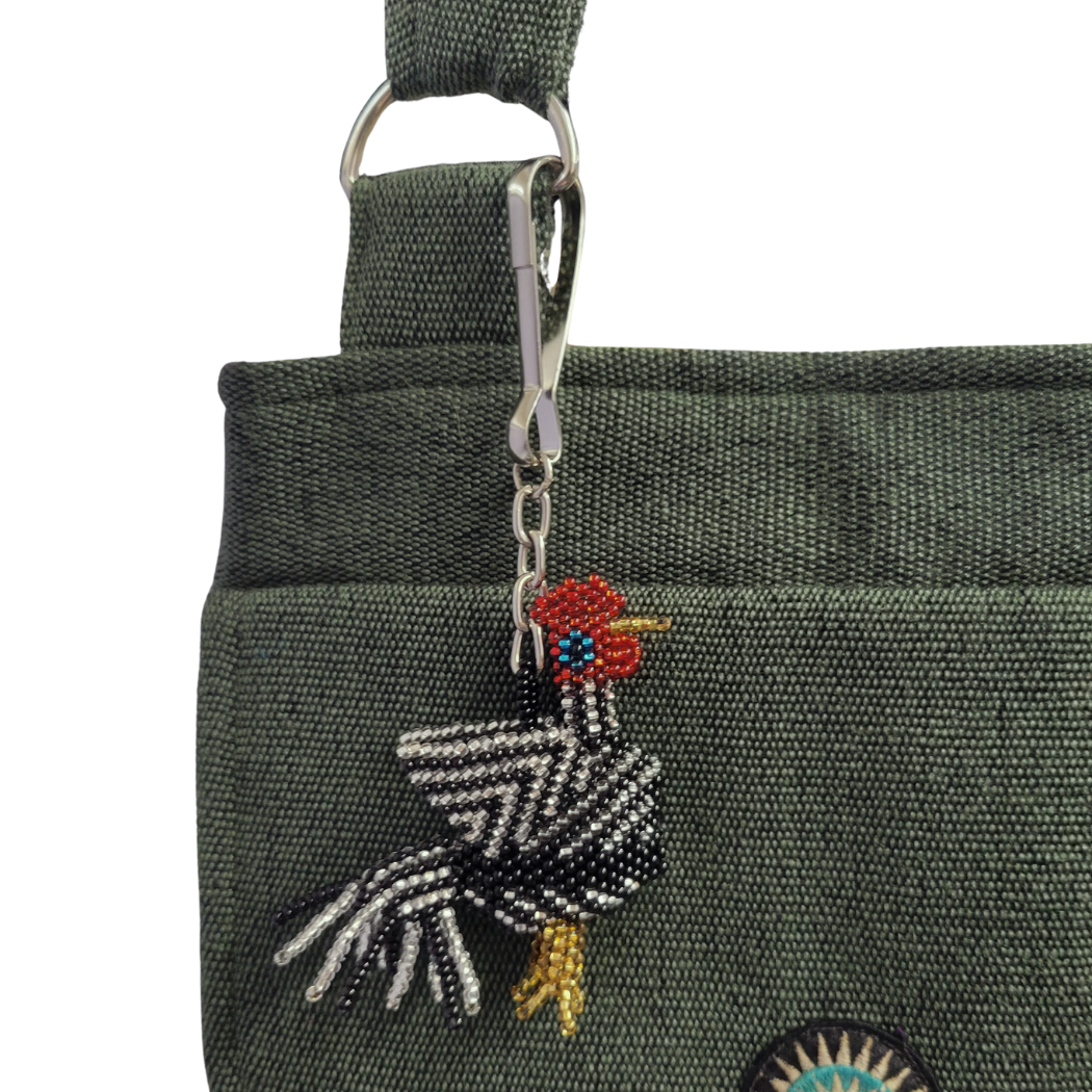 This rooster will wake up the plainest bag or backpack. The charm, made entirely of seed beads, has wings and tail feathers that move.