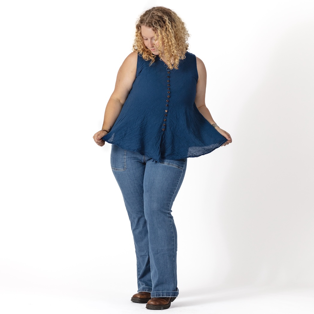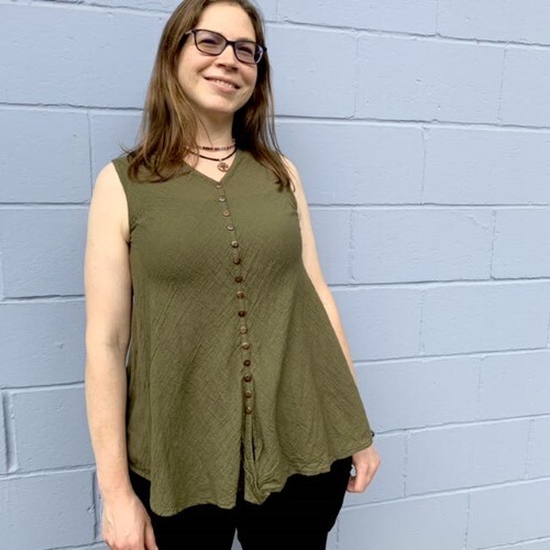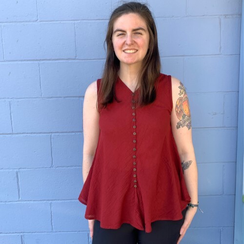 With an elegant line of dark brown buttons, carved from coconut shell, this v-neck top has a real touch of class. Made of lightweight cotton, it will keep you cool as well as stylish. One size.