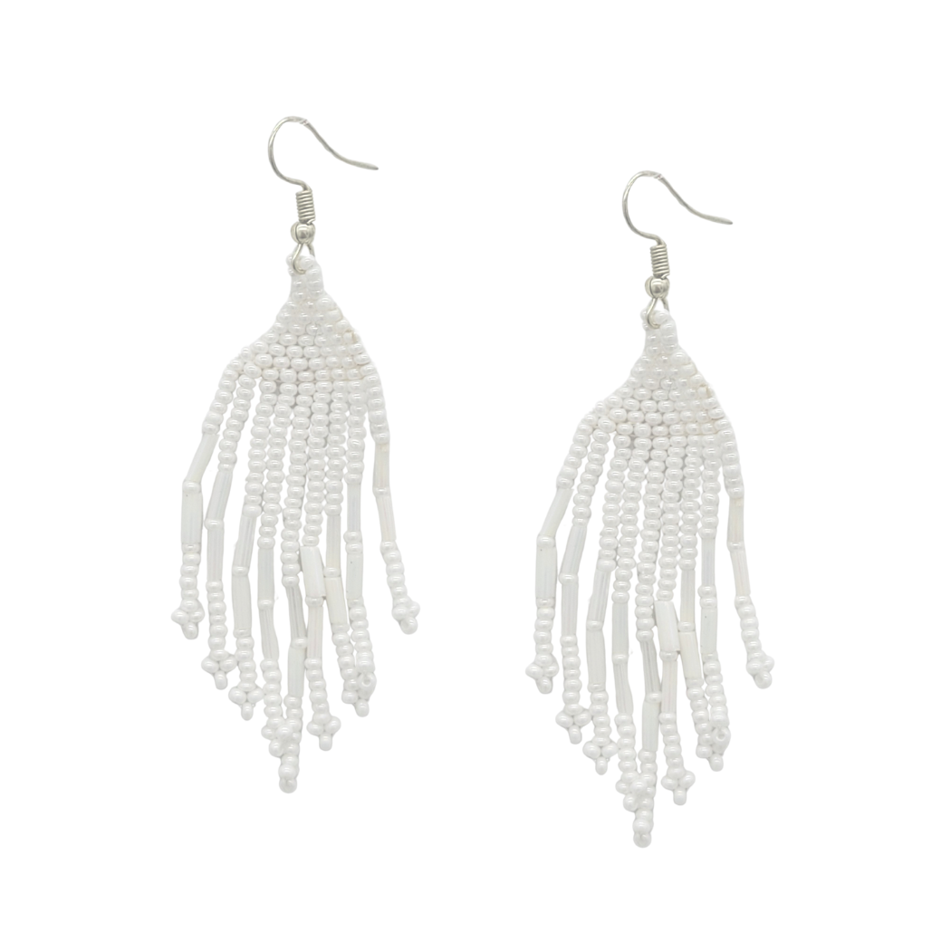 Understated yet eye-catching, these earrings feature nine strands of sparkling seed beads. The iridescent white option features tube-shaped beads as well.