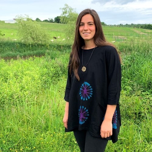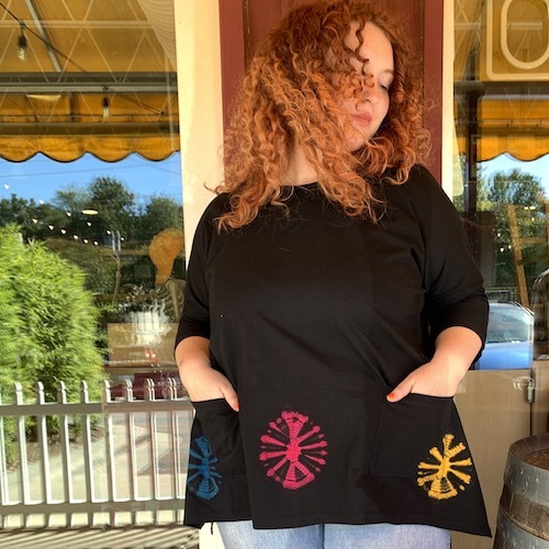 Tie-dyed starbursts add bright splashes of color to this comfortable top. Made of 100% cotton, it features three-quarter sleeves and a pair of pockets in front. One size.
