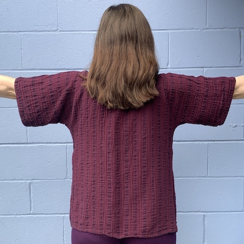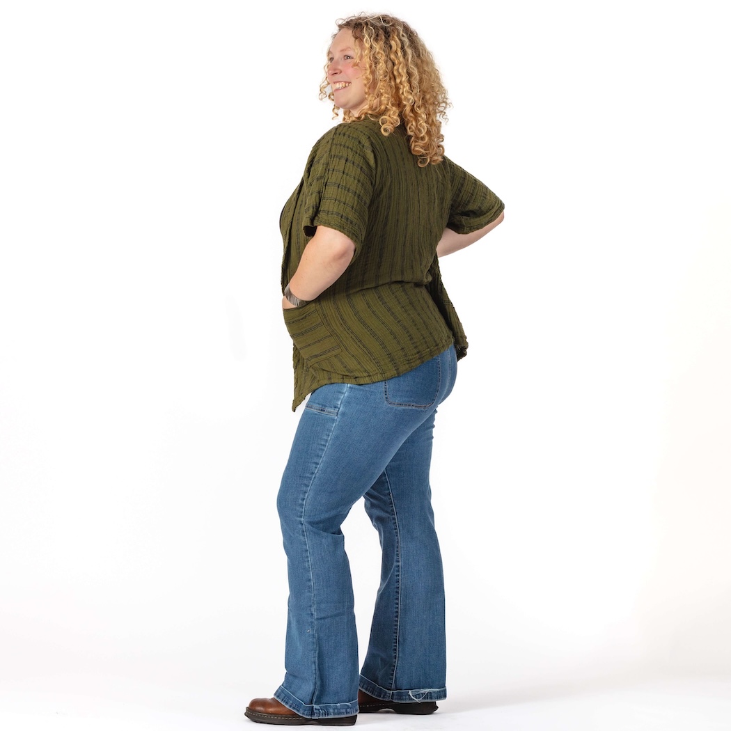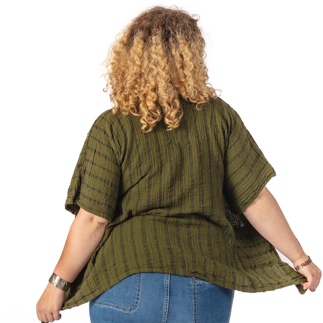 This short-sleeved jacket is long on style, thanks to its gauzy cotton pinstripes. Light and flowy, with a pair of pockets in front, it's great for throwing over a t-shirt or a tank top. One size.