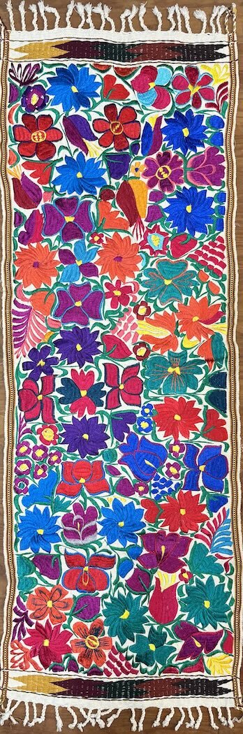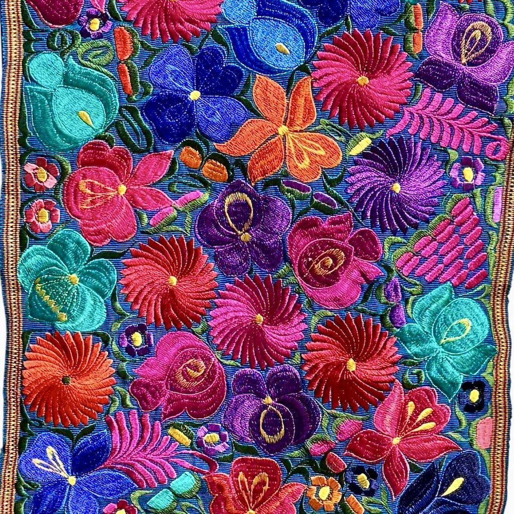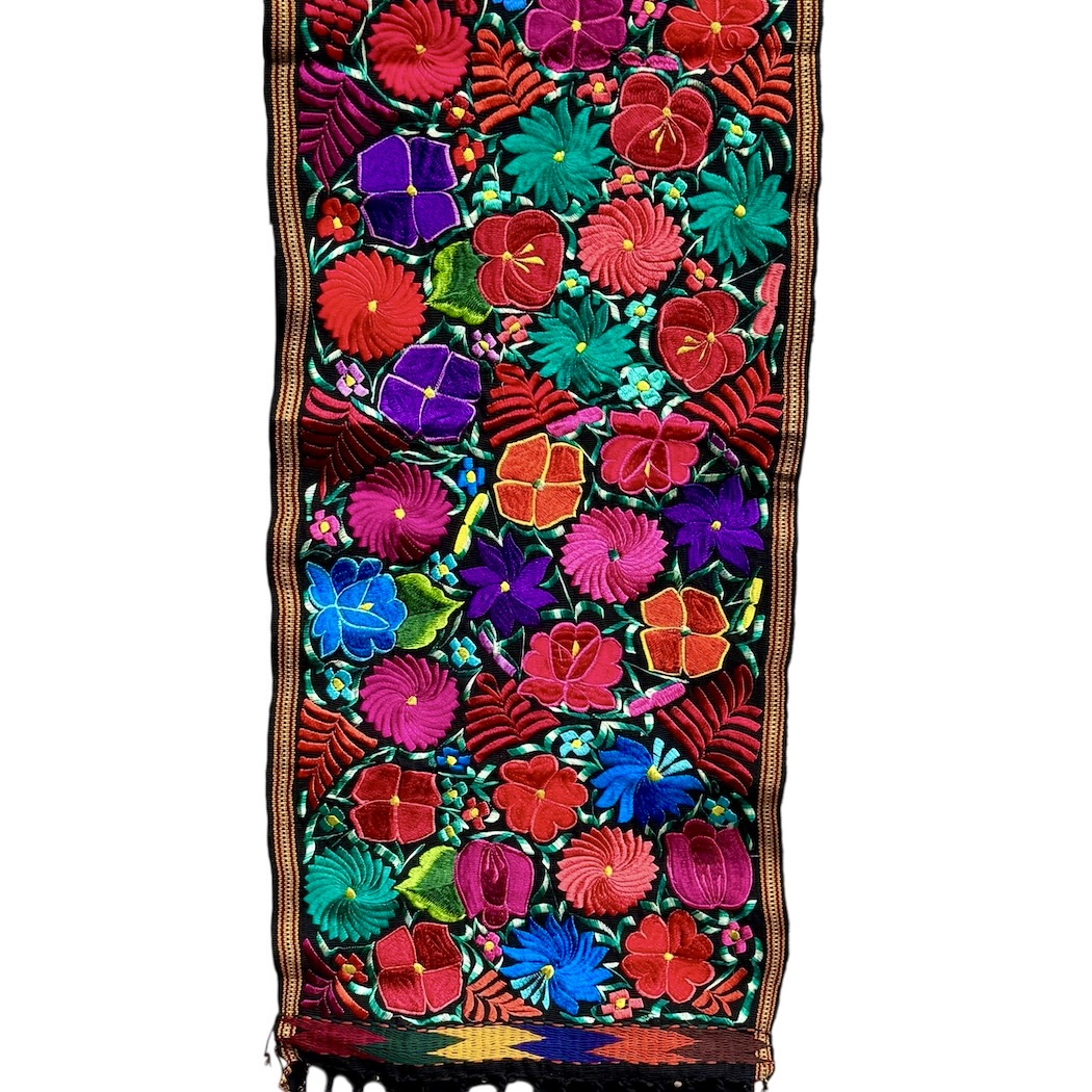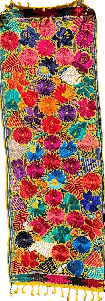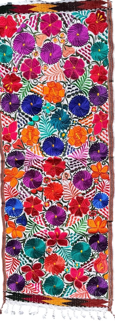 These embroidered pieces will add color to any table or wall. They are finely hand woven in the town of Zalcualpa Guatemala. The flower pattern is drawn on the fabric The artisan then embroiders on top of the fabric using a color palate of thread, changing shades of colors much the way a painter does, to get the beautiful color combination you see.