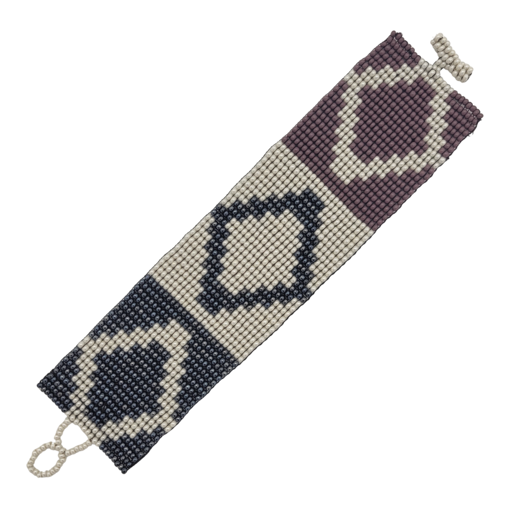 Hundreds of Czech glass seed beads are handwoven together to create this diamond-patterned cuff bracelet. Its size makes it bold enough to be a statement piece without overwhelming your look. The bracelet features a handwoven palette of cream, gray, and purple tones, finished with a secure "T" closure and loops.