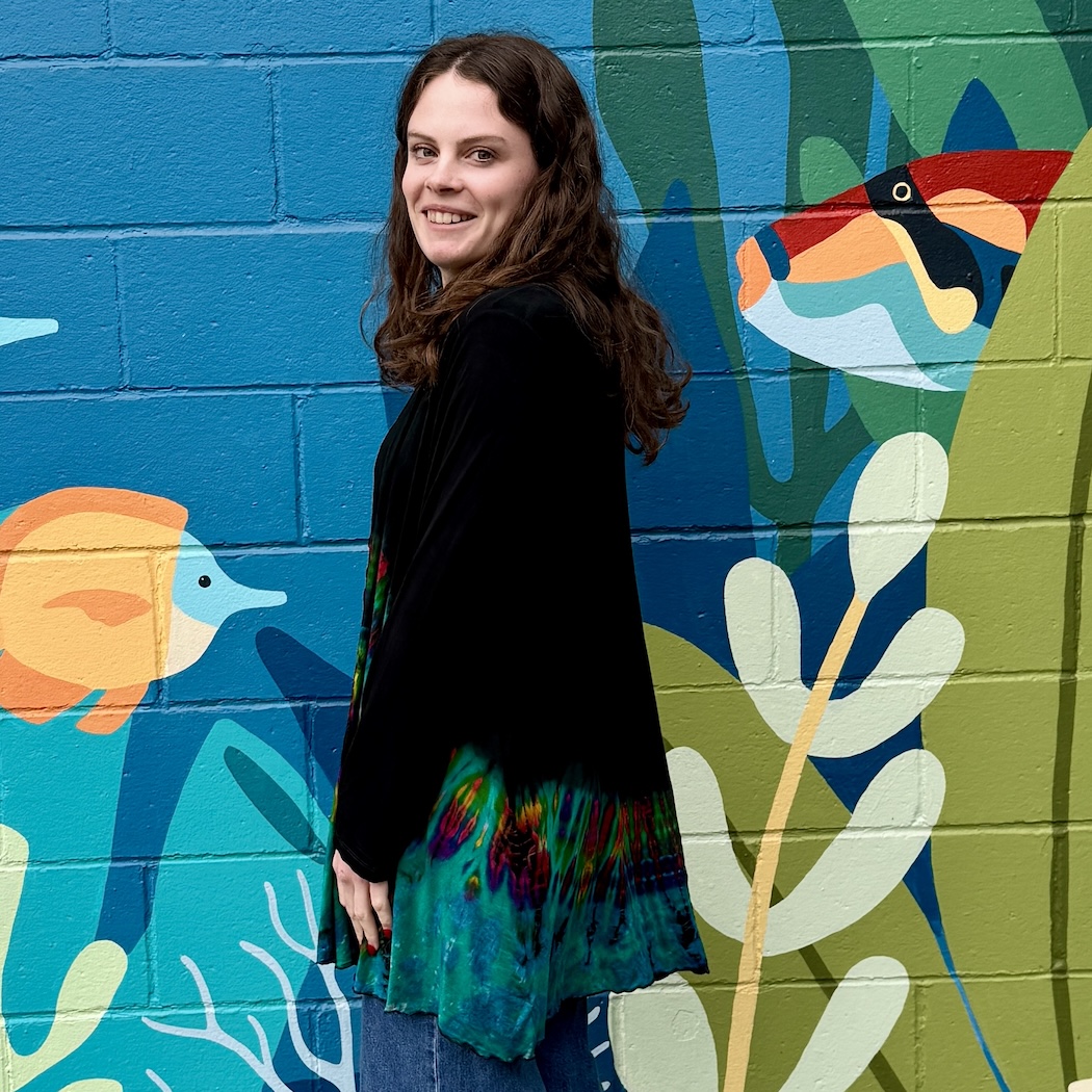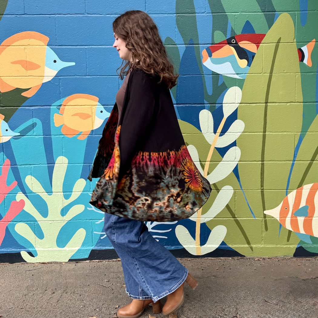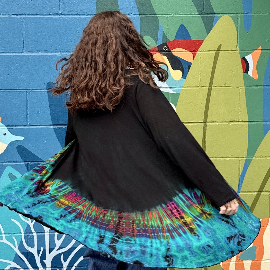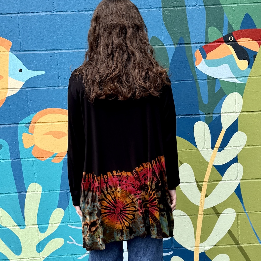 Made of soft, tie-dyed spandex, this stunning long-sleeved jacket combines basic black with vibrant colors. And, with a longer cut on each side, the cardigan has a lovely draping effect. One size.