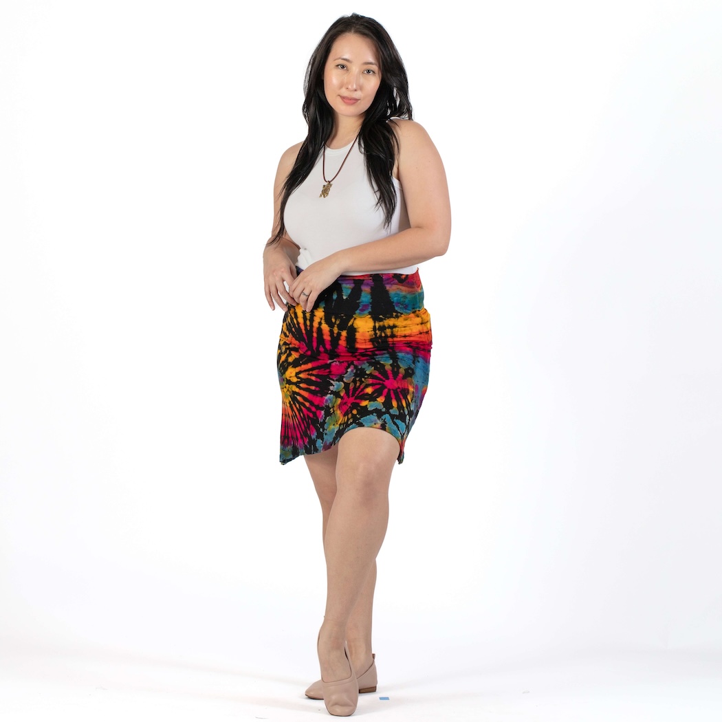 Knee-length and wrinkle-free, this lightweight spandex skirt is just right for hot summer days. The fit is flattering, with tie-dyed patterns as bright as the sun! One size.