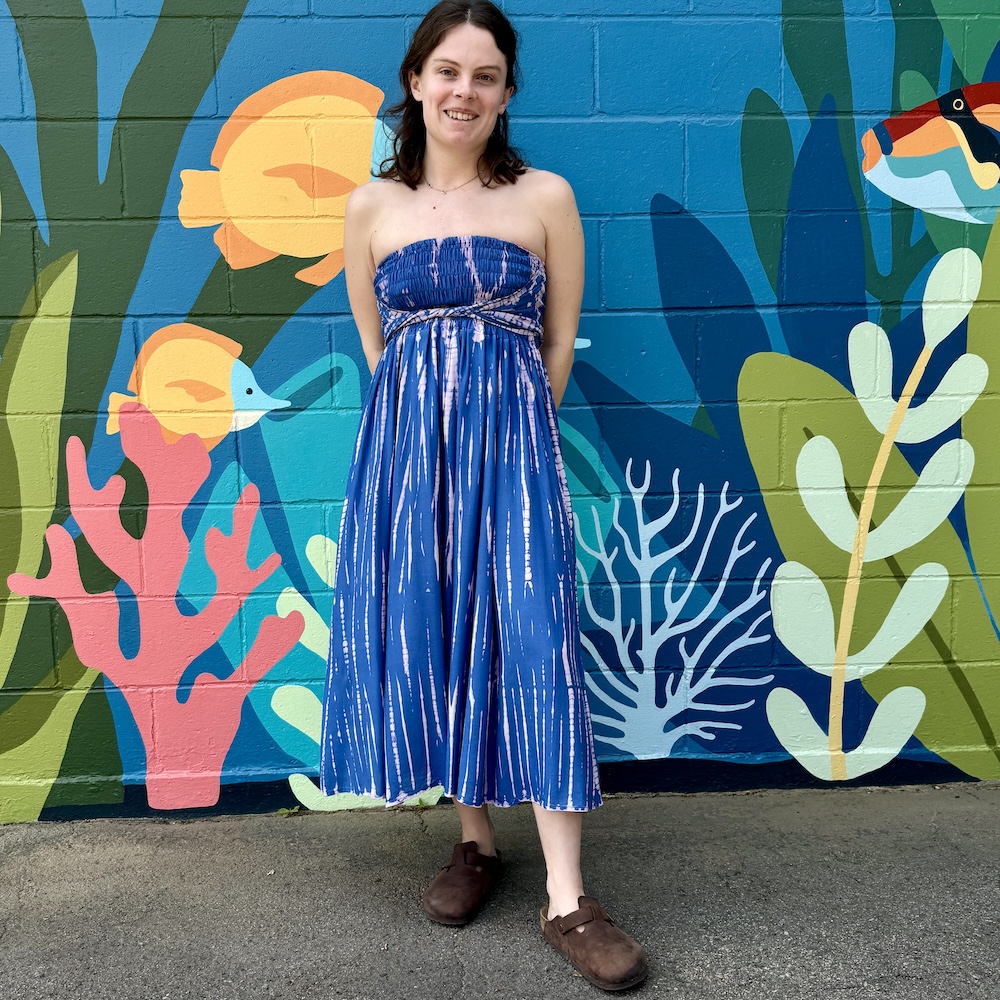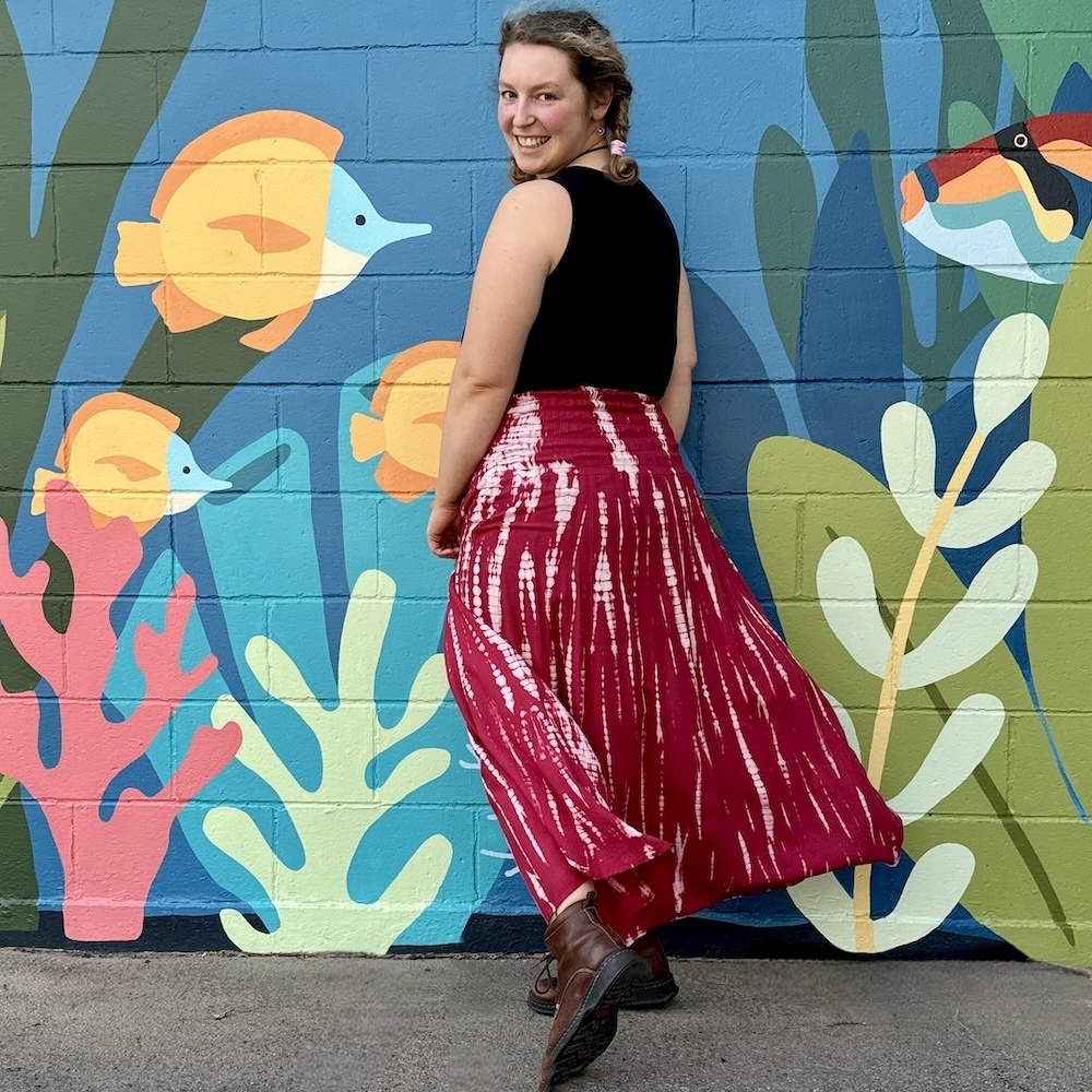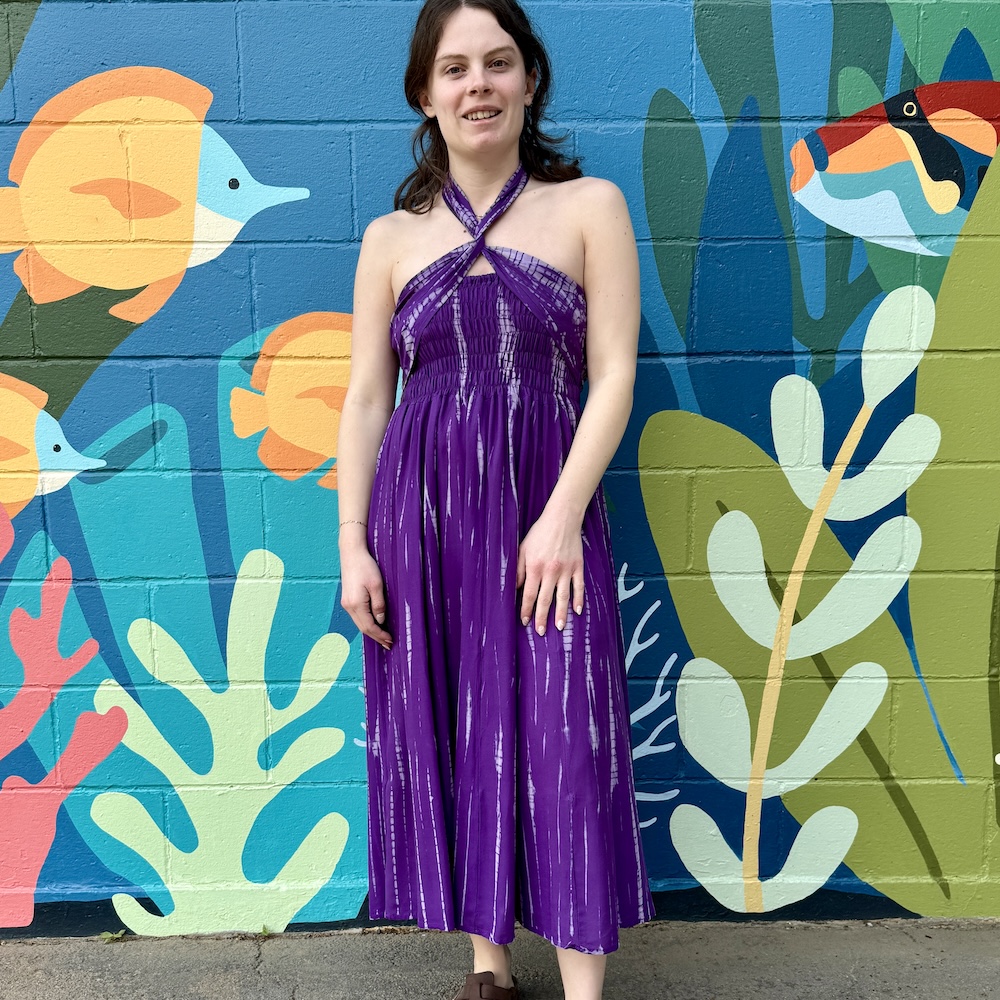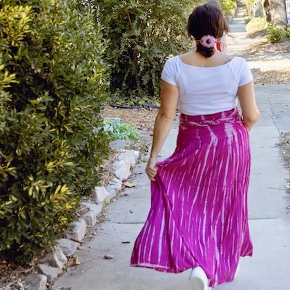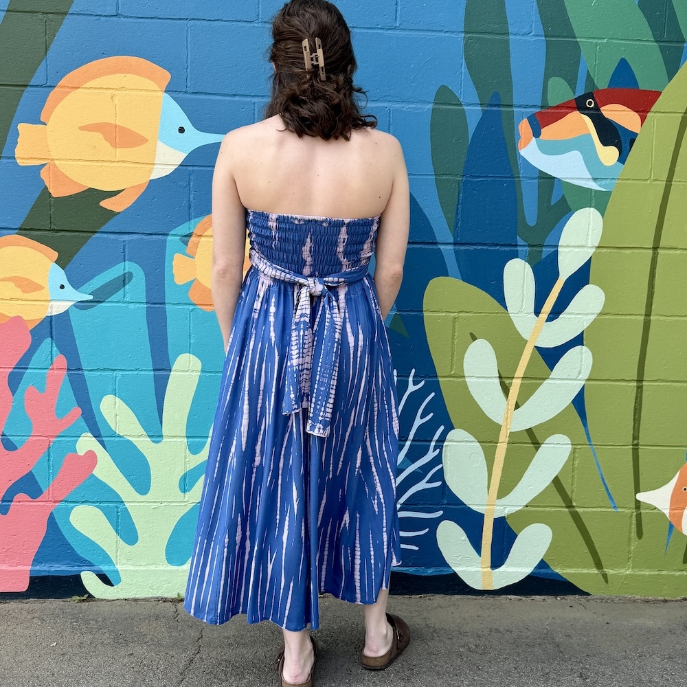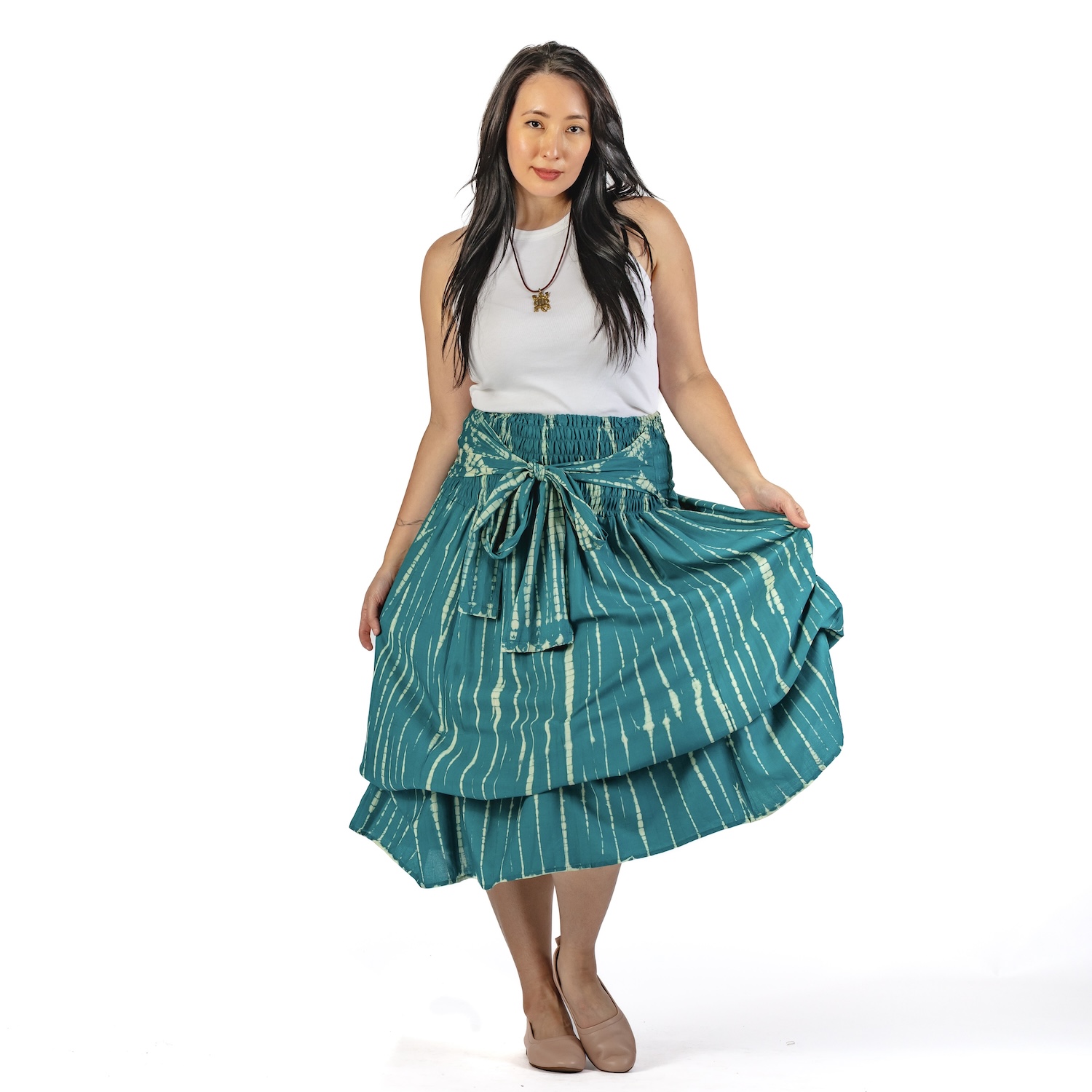 You can wear this tie-dyed rayon piece as a skirt or as a dress, letting it hang loose or tying the strings at the bottom -- for a fun balloon effect. One size.