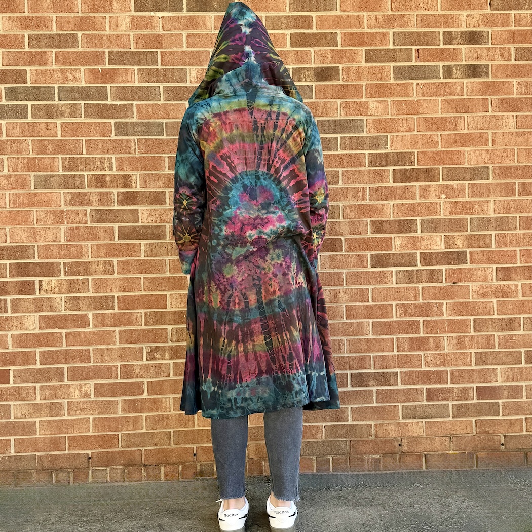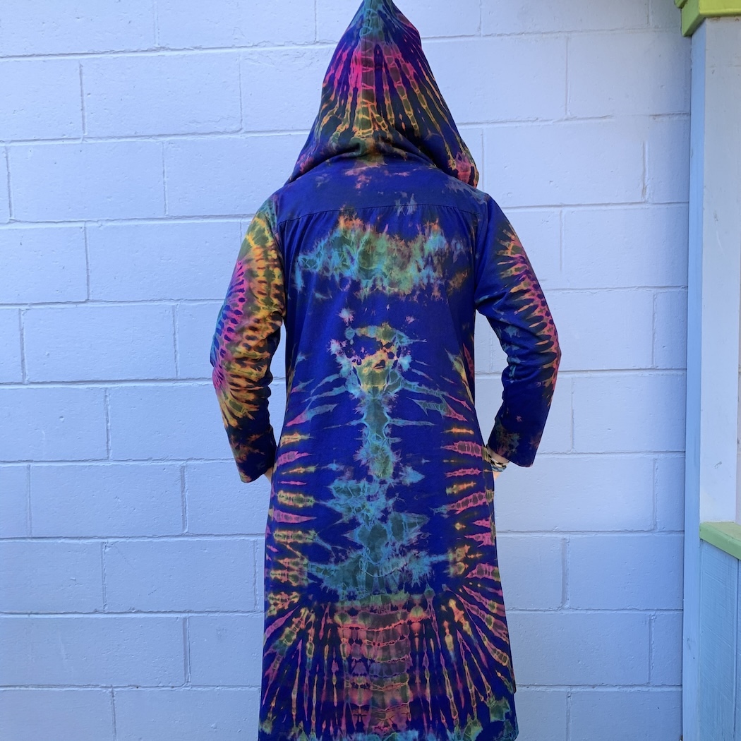 Cover up in style! This roomy jacket features an extra large hood, with cotton pull ties, as well as a flattering flare and snazzy tie-dyed designs. What's more, it boasts a line of gleaming buttons, carved from coconut shell. One size.