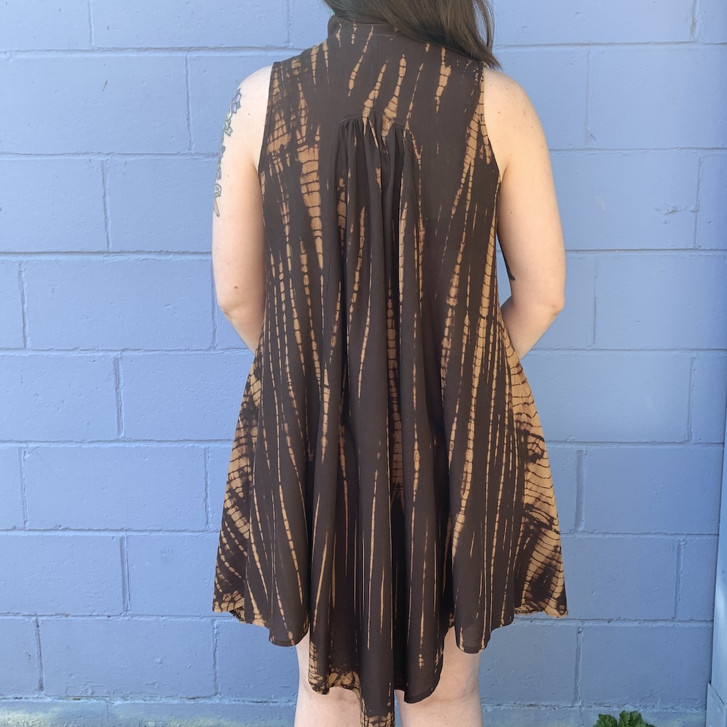 Simplicity meets sophistication in this sleeveless dress, made of richly tie-dyed rayon. Along with its v-neck, the lightweight piece features a stylish "v" in the back. One size.