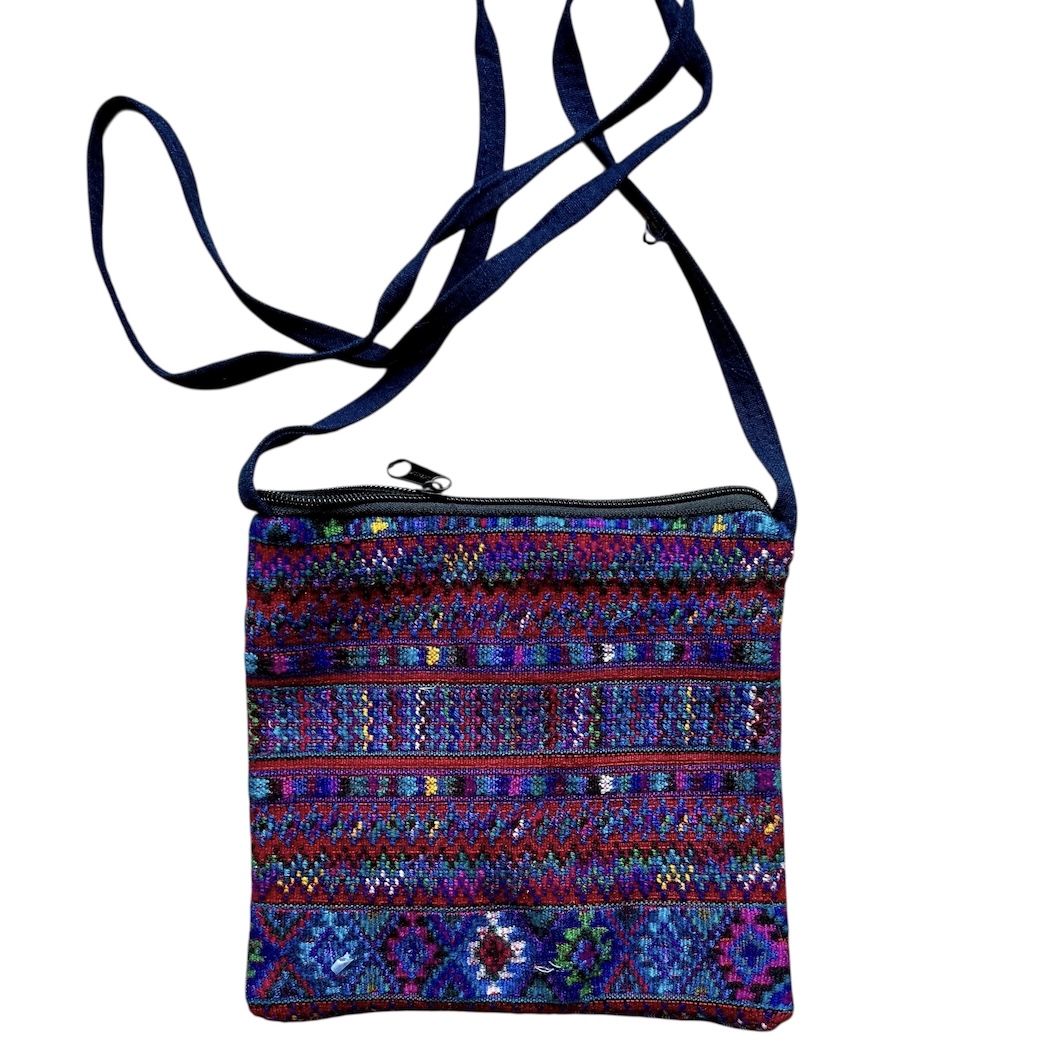 With its rich, saturated colors, this crossbody bag is sure to attract attention. The front boasts a distinctive patch of handwoven cotton, while the back features energetic stripes.