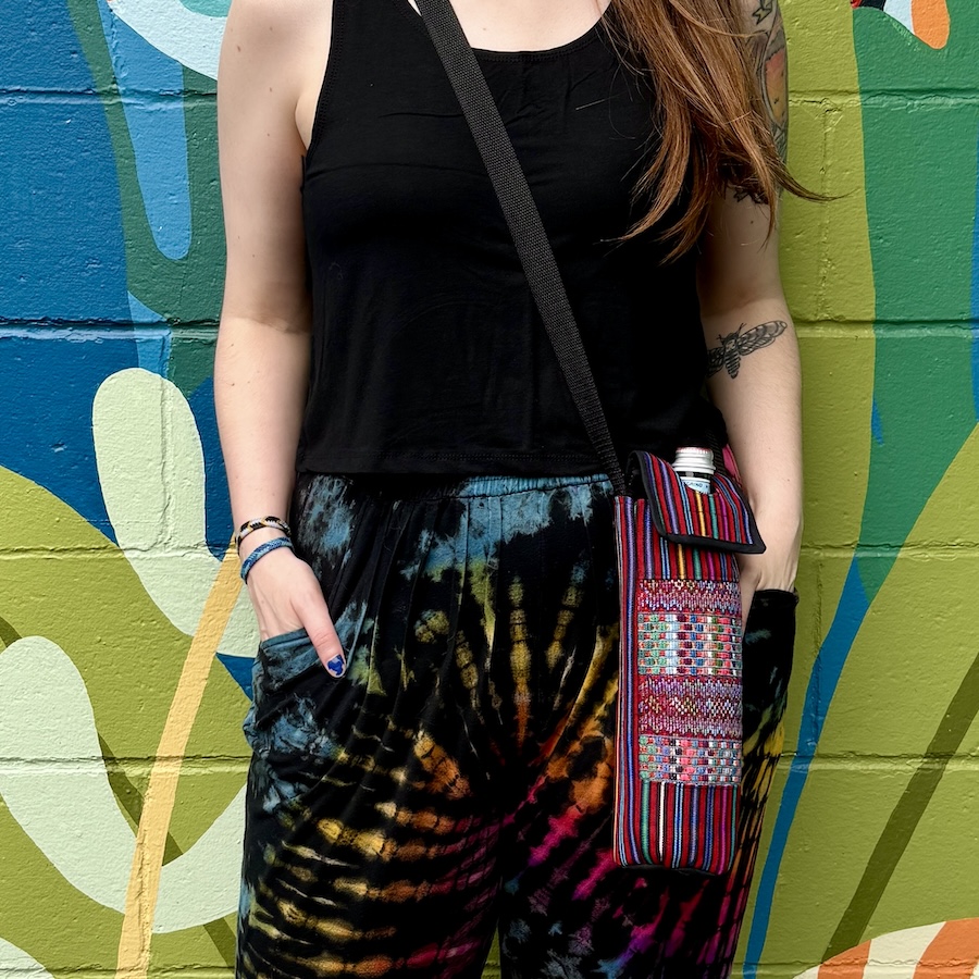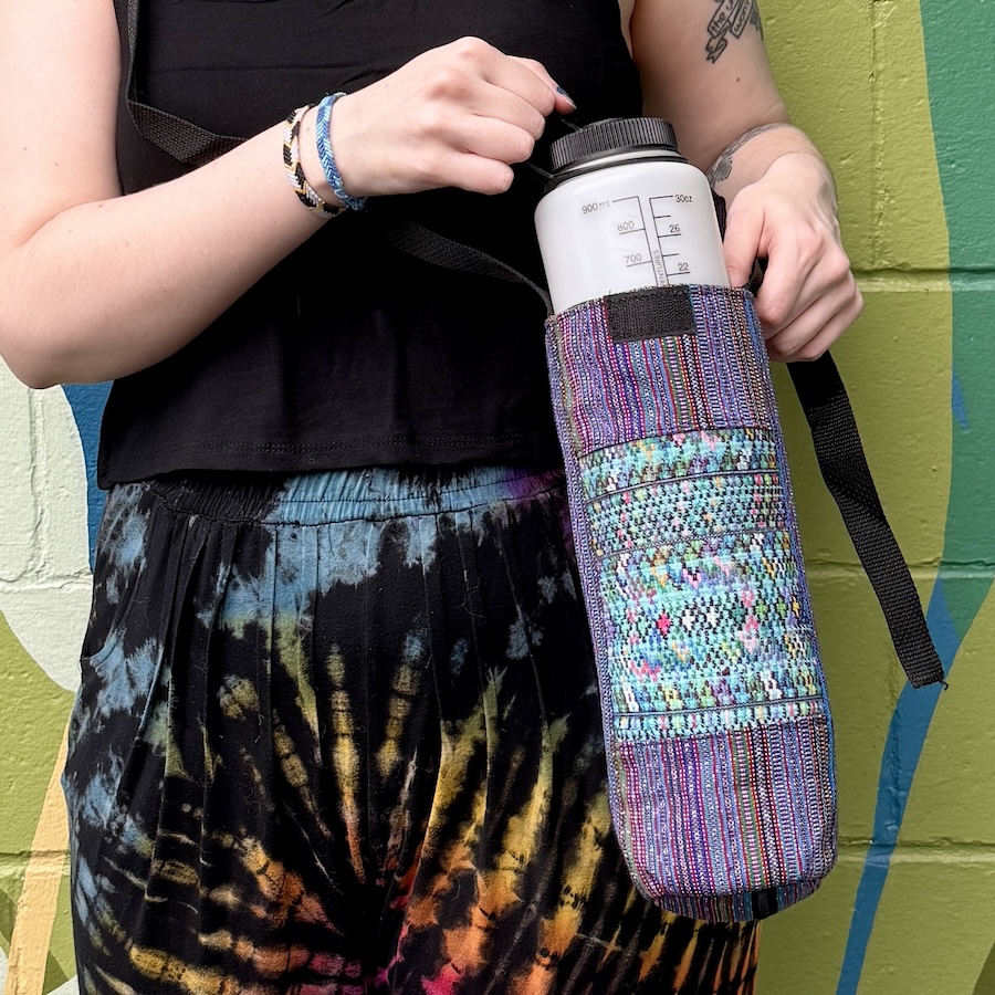 Stay seriously hydrated with this big, colorful holder, made of repurposed, handwoven cotton. In addition to a velcro flap and adjustable strap, the bag has a convenient opening for a tall bottle or drinking straw. Assorted colors and designs.