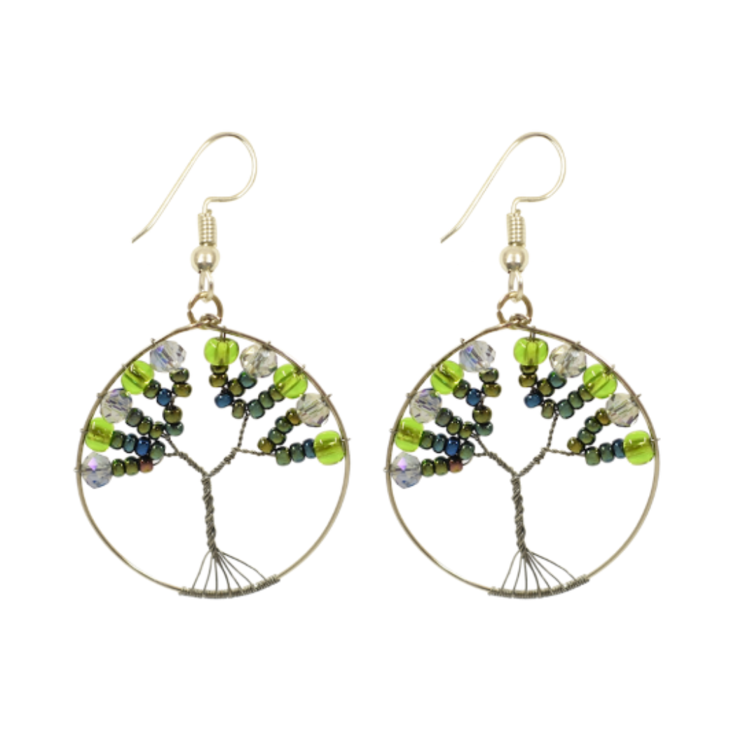 The tree of life symbolizes good health and, yes, long life. Our earring version features a wire tree inside a wire hoop, with "leaves" made of multicolored glass beads, in various shapes and sizes.
