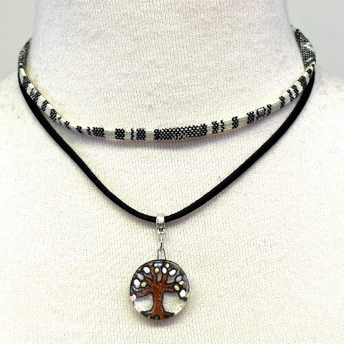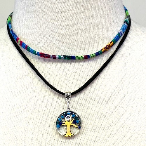 This lovely layered choker features a hand-painted tree of life, floating in a circle of fused glass. A barrel bead attaches the pendant to a leatherette cord, which, in turn, connects with a colorful woven band. Assorted colors.