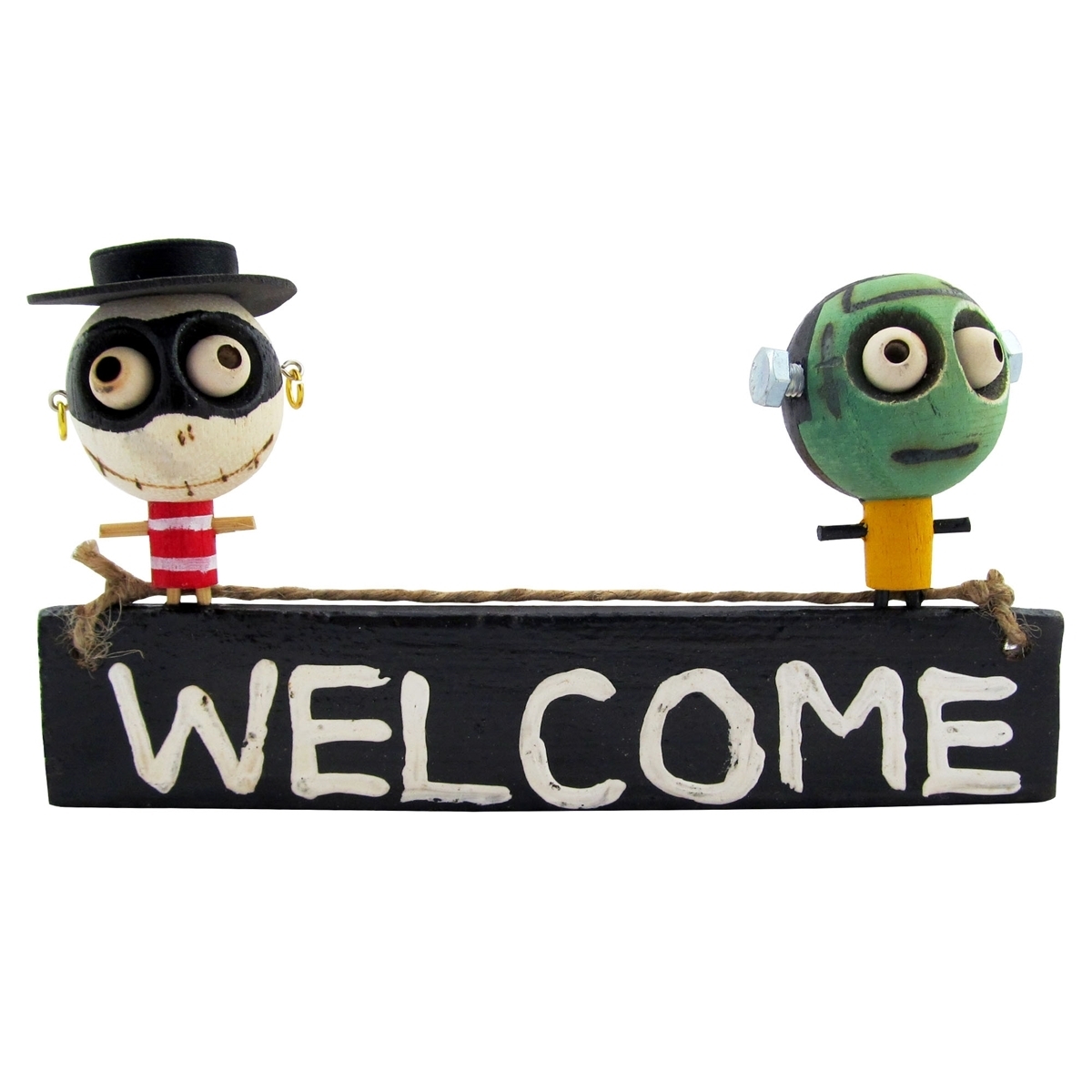 On this cute little sign, two comical figures offer a spooky "welcome." Both the sign and the figures are made of wood, painted by hand, with leather and metal accents. There's a twine cord as well, for easy hanging.