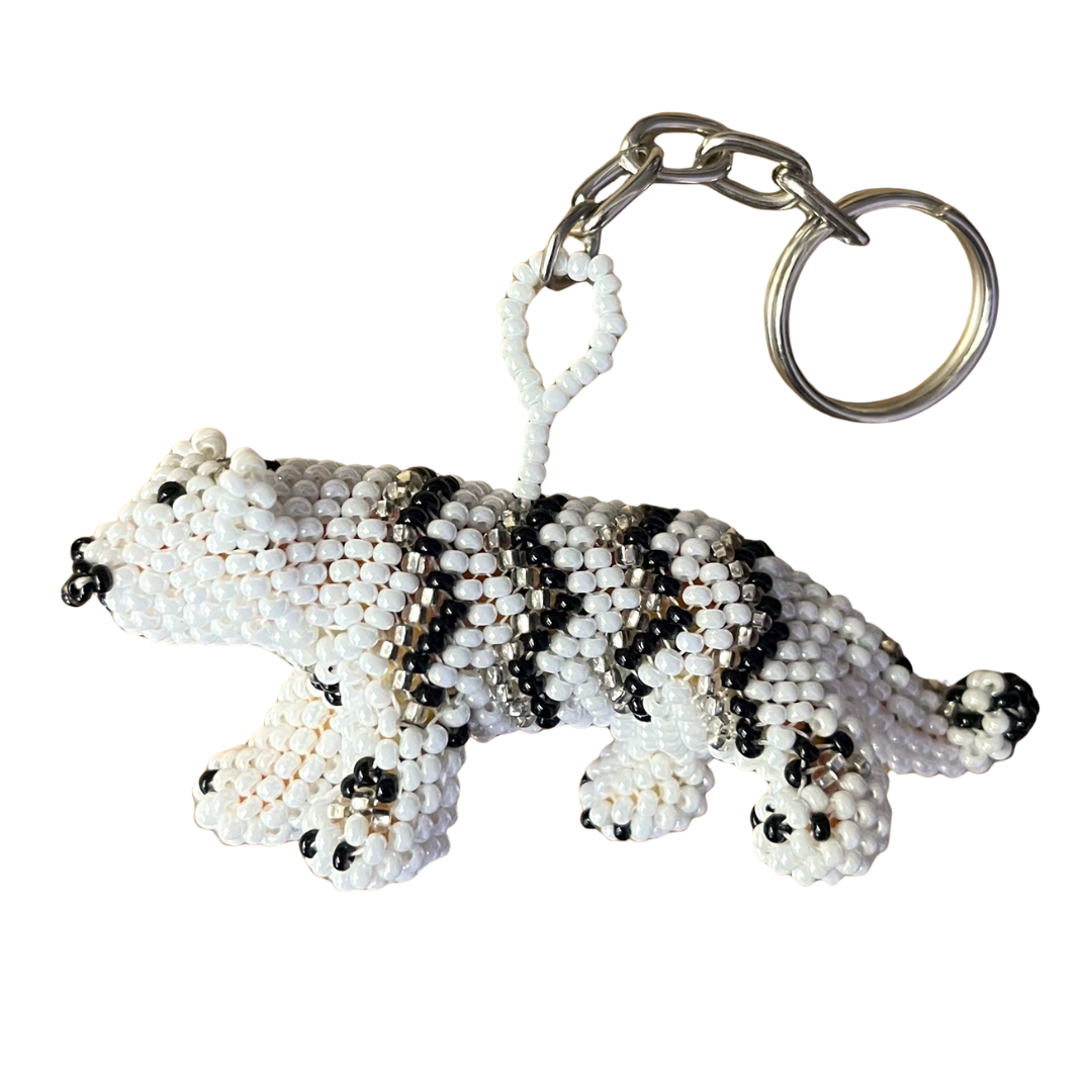 A rare breed of tiger makes a one-of-a-kind keychain. White seed beads, with black and silver accents, create a fearsome cat that stands on its own.