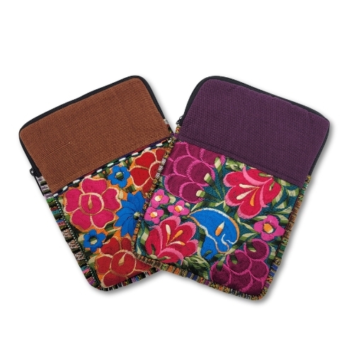 This cushy artisan-made bag mixes repurposed 100% cotton CORTE fabric with vibrant floral embroidery to create a one-of-a-kind puffy travel case for your electronics. Because they're made with upcycled fabric, each one is a little bit different. The patterned corte on the back is strong and durable, while the embroidery on the front highlights the craftsmanship put into each pouch. The zip top and interior padding will protect your phone, headphones, earbuds, and power cords.